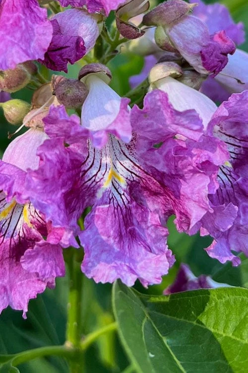 An intergeneric hybrid of desert willow (Chilopsis linearis) and catalpa (Catalpa sp.). El Nino Desert Orchid thrives in a much wider range and is much easier to care for than either of its parents. It is tolerant to the poor soils and dry heat of the West, as well as the heat and humidity in southern climates. It features abundant clusters of absolutely beautiful, sweetly scented, orchid-like flowers in purple shades. Depending on your location the flowers start coming in late spring to early summer and continue sporadically through the summer. Destined to be a lovely asset in the landscape, and a conversation piece for sure, at 6 to 8 feet tall and 5 to 6 feet wide El Nino is a fine accent in small to medium size spaces or in groupings where space will allow, though we do suggest spaced groupings so that each plant stands out on it’s own. That said, you can create a hedge with it if you like, or remove lower branches to form a small tree, or grow it in a container. The choice is yours!Â