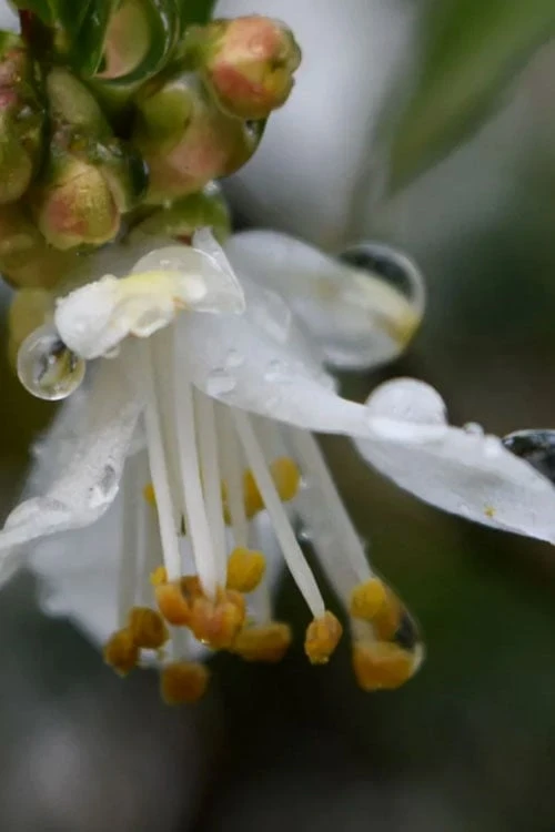 Discovered by Chengdu Nursery growing in the wild of Sichuan, and extremely rare in the United States, Camellia parvilimba is a winter bloomer (Jan to Feb) producing an abundance of small, trumpet-shaped fragrant flowers with white petals surrounding golden stamens. The new leaves emerge scarlet red and turn to a lustrous dark olive-green. The leaves are perhaps the smallest of any camellia, providing fine texture in the garden. As camellias go, it is a dwarf growing to about 3 to 4 feet tall and equally as wide with an upright spreading habit. Everything about this camellia is small compared to its larger growing cousins, which makes it a perfect fit for smaller garden spaces where it’s sure to be a conversation piece!